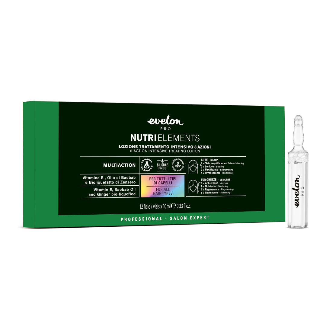 8 azioni in un unico trattamento: la nuova lozione intensiva Nutri Elements agisce sulla cute, fortificandola e rivitalizzandola, e sulle lunghezze, togliendo l’effetto anti-crespo e donando lucentezza ed idratazione al capello.